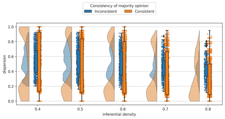 Our goal was to understand whether groups are more or less likely to aggregate inconsistent group opinions on argument maps depending on their opinion diversity and belief polarisation scores. We measured opinion diversity through the Gini-Simpson index (Tuomisto 2010), and polarisation in terms of statistical dispersion (Bramson et al. 2017). We synthesised thousands of argument maps as well as groups that all hold validity-respecting views in light of these maps, but that have varying opinion diversity and belief polarisation.